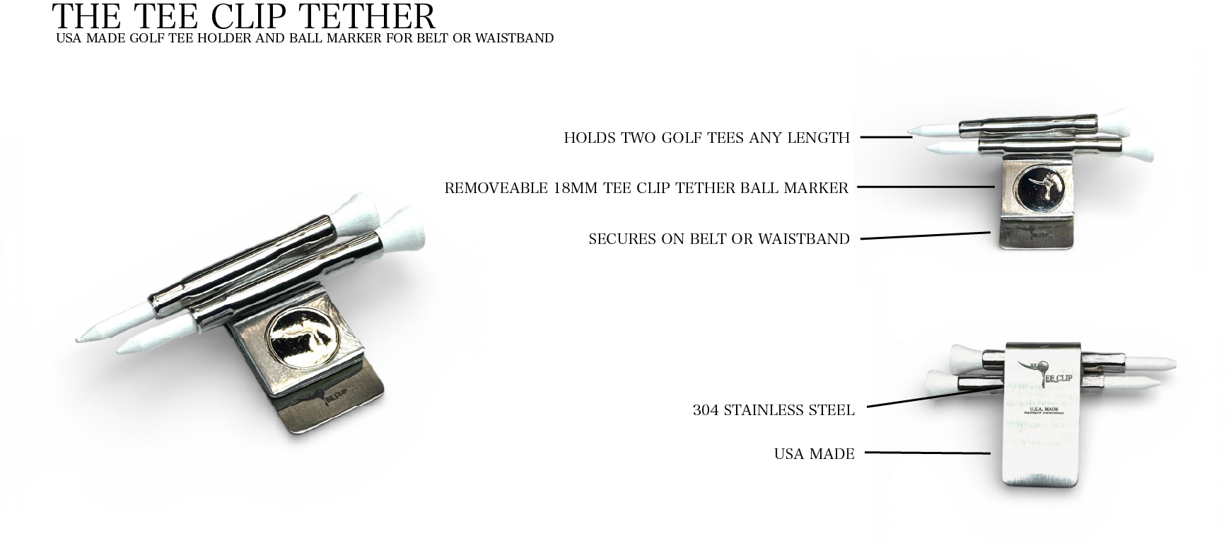 Tee Clip® Tether™: 米国製 | ベルトまたはウエスト用のゴルフティーホルダー | ティー 2 本と 18mm ボールマーカー用のダブルバレル | 特許出願中